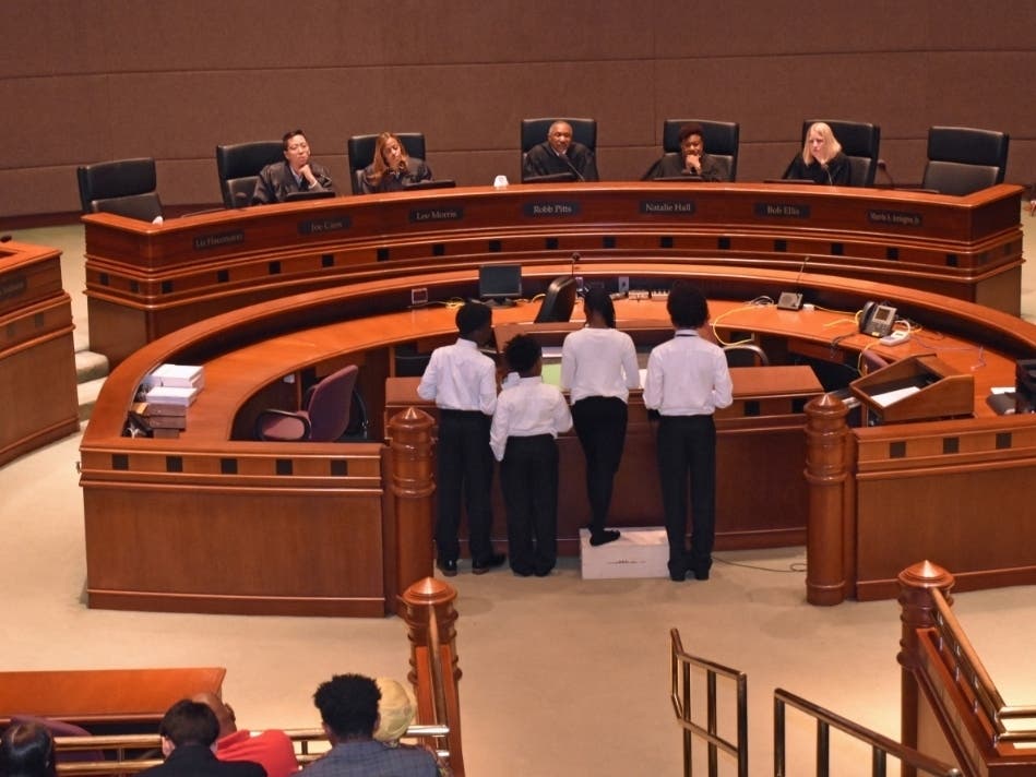 The moderators are Emma Katz, a two-time participant in The Young Litigators Project and a freshman at Maynard Jackson High School, and Kemoni Dunn, a seventh grade student at Martin Luther King Jr. Middle School.