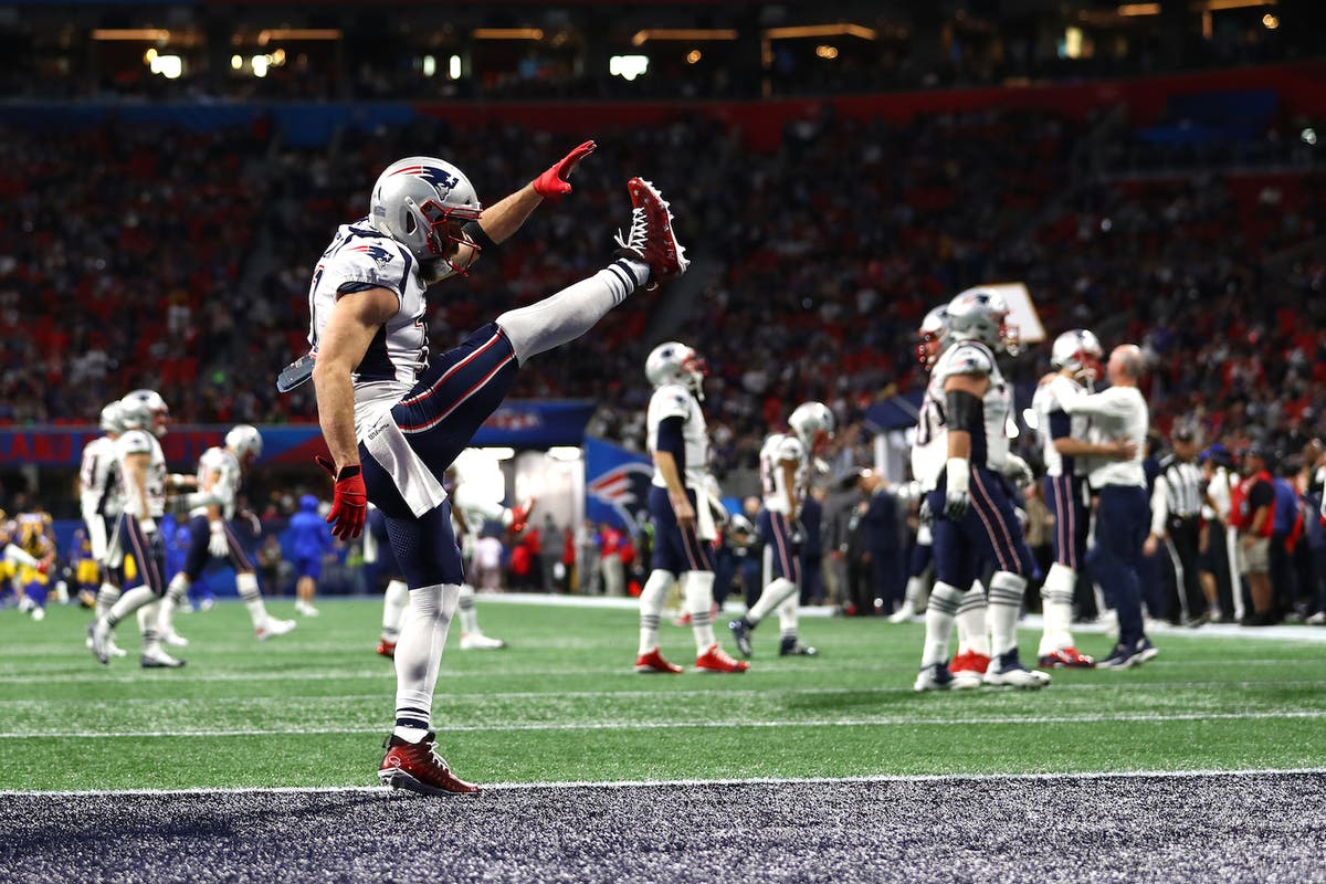 Rob Gronkowski #87 of the New England Patriots reacts against the Los Angeles Rams during the second half.