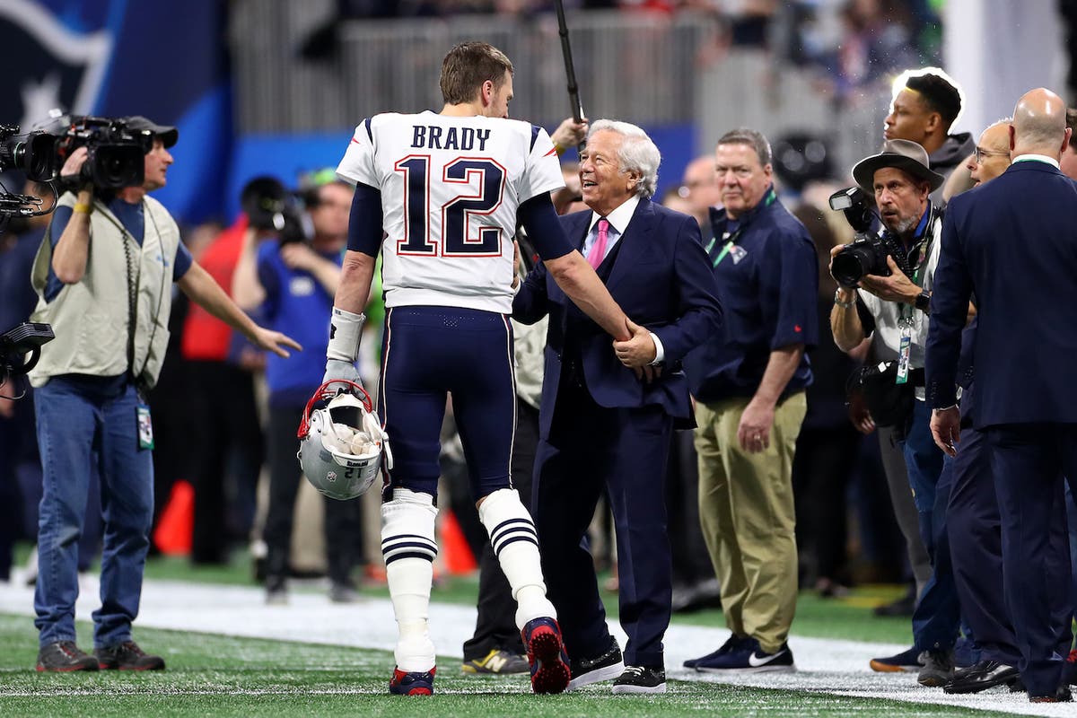 Tom Brady speaks with owner Robert Kraft prior to Super Bowl LIII on February 03, 2019..