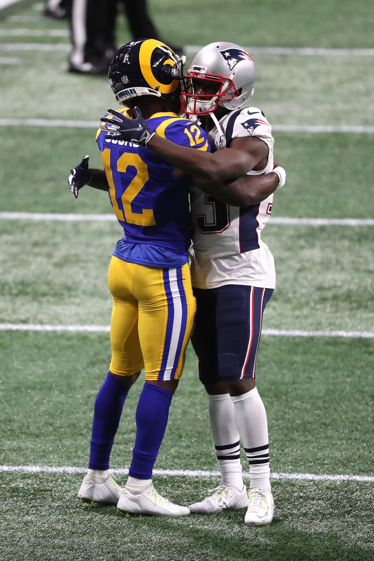 Brandin Cooks (#12) of the Los Angeles Rams greets Patrick Chung (#23) of the New England Patriots prior to Super Bowl LIII on February 03.