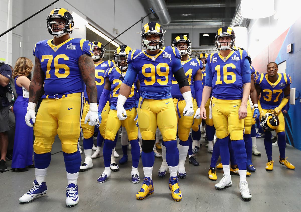 Rodger Saffold (#76), Aaron Donald (#99), and Jared Goff (#16) of the Los Angeles Rams prepare to take the field prior to kickoff at Super Bowl LIII against the New England Patriots at Mercedes-Benz Stadium on February 3, 2019 in Atlanta, Georgia.