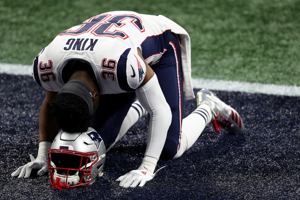 Brandon King #36 of the New England Patriots kneels in the endzone during warm ups.