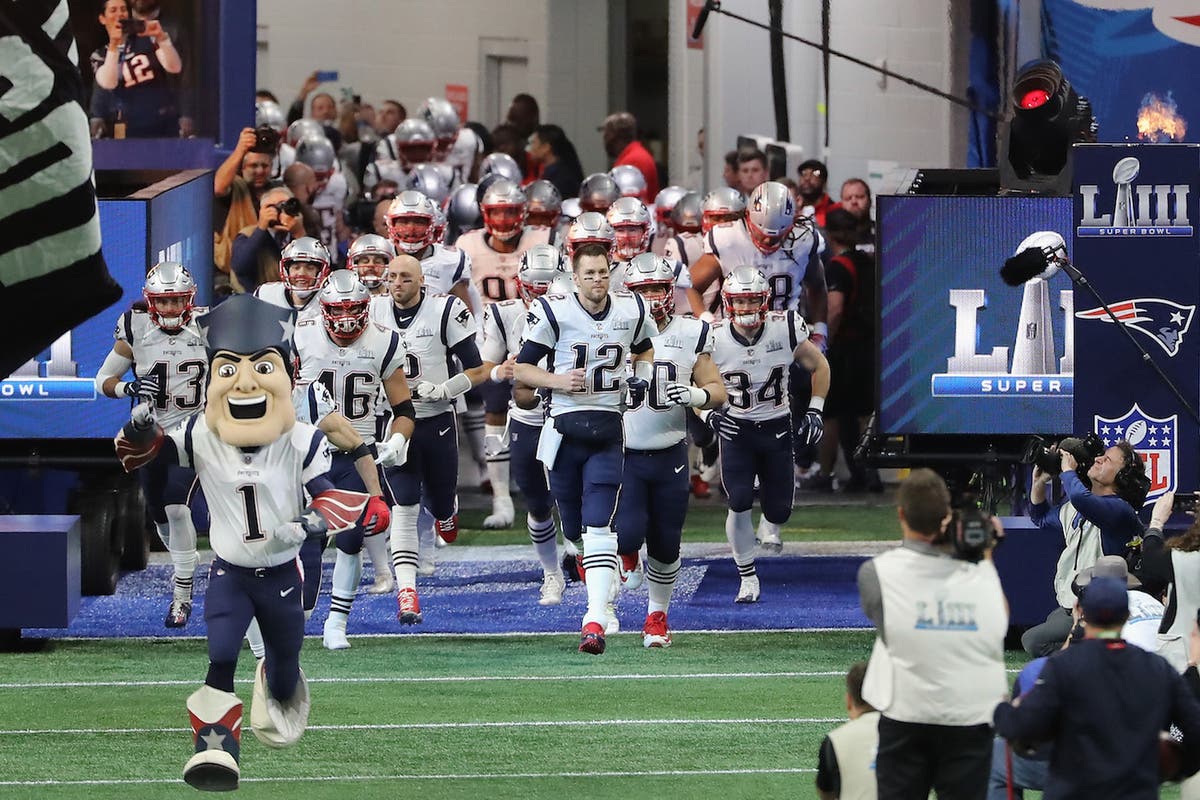 Tom Brady (#12) of the New England Patriots and his teammates take the field prior the start of the Super Bowl LIII against the Los Angeles Rams.