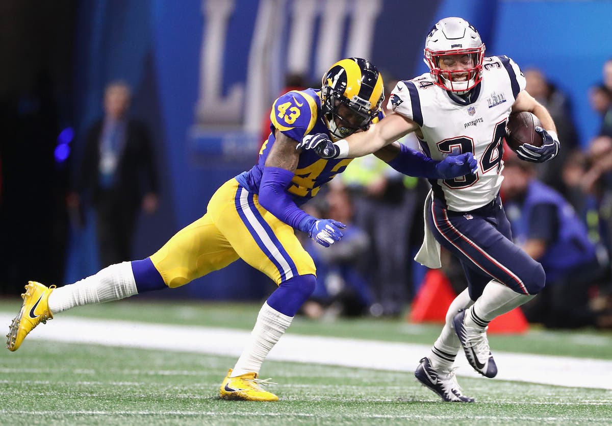 Rex Burkhead (#34) of the New England Patriots runs the ball agaisnt John Johnson III (#43) of the Los Angeles Rams in the first quarter.