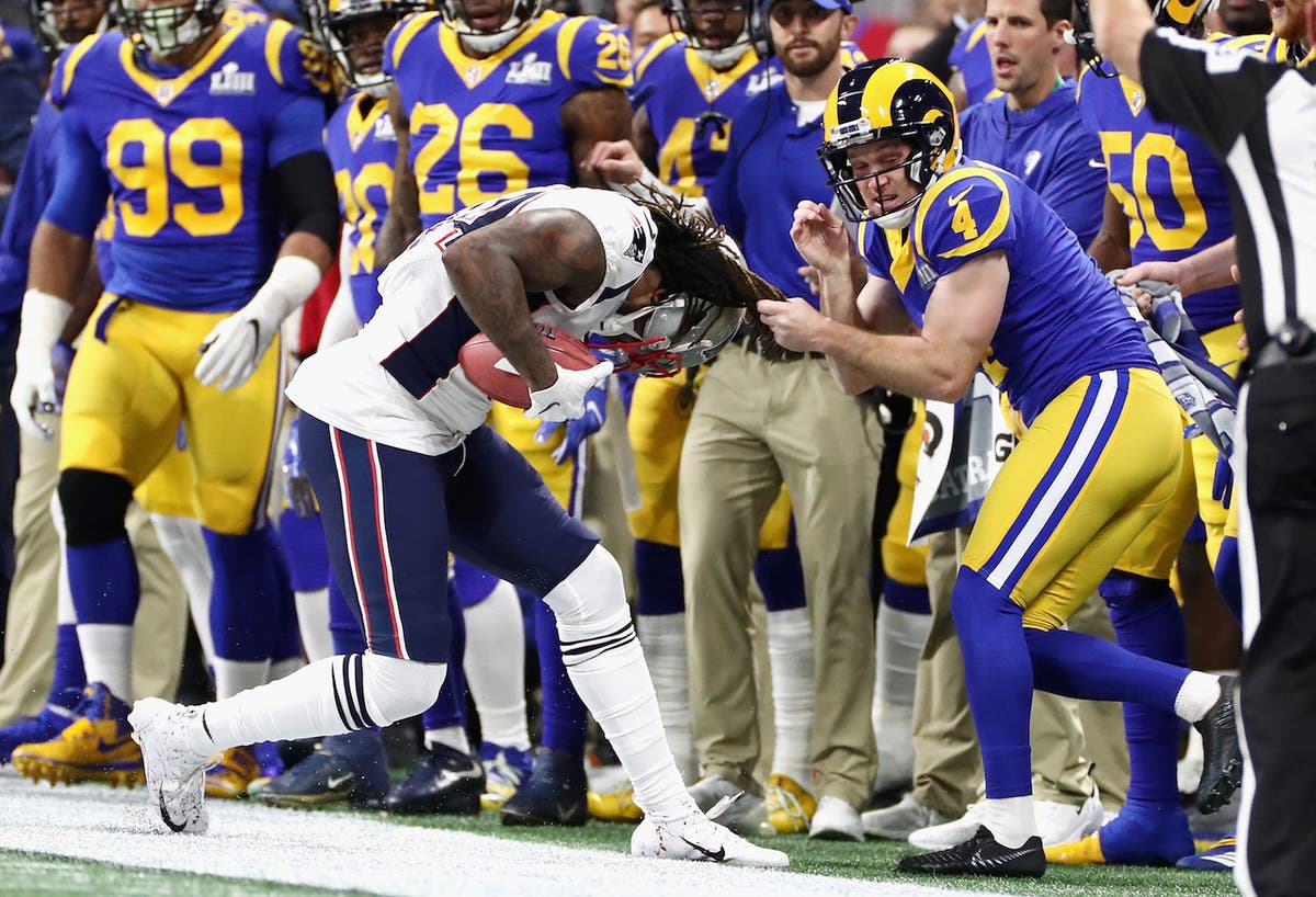 Greg Zuerlein (#4) of the Los Angeles Rams makes a tackle against the New England Patriots in the first half.
