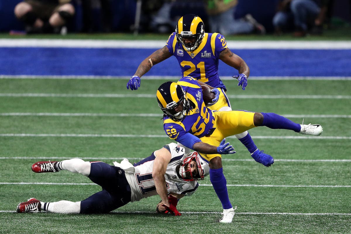 Cory Littleton (#58) of the Los Angeles Rams intercepts the ball in the first quarter on a pass intended for Julian Edelman (#11) of the New England Patriots.