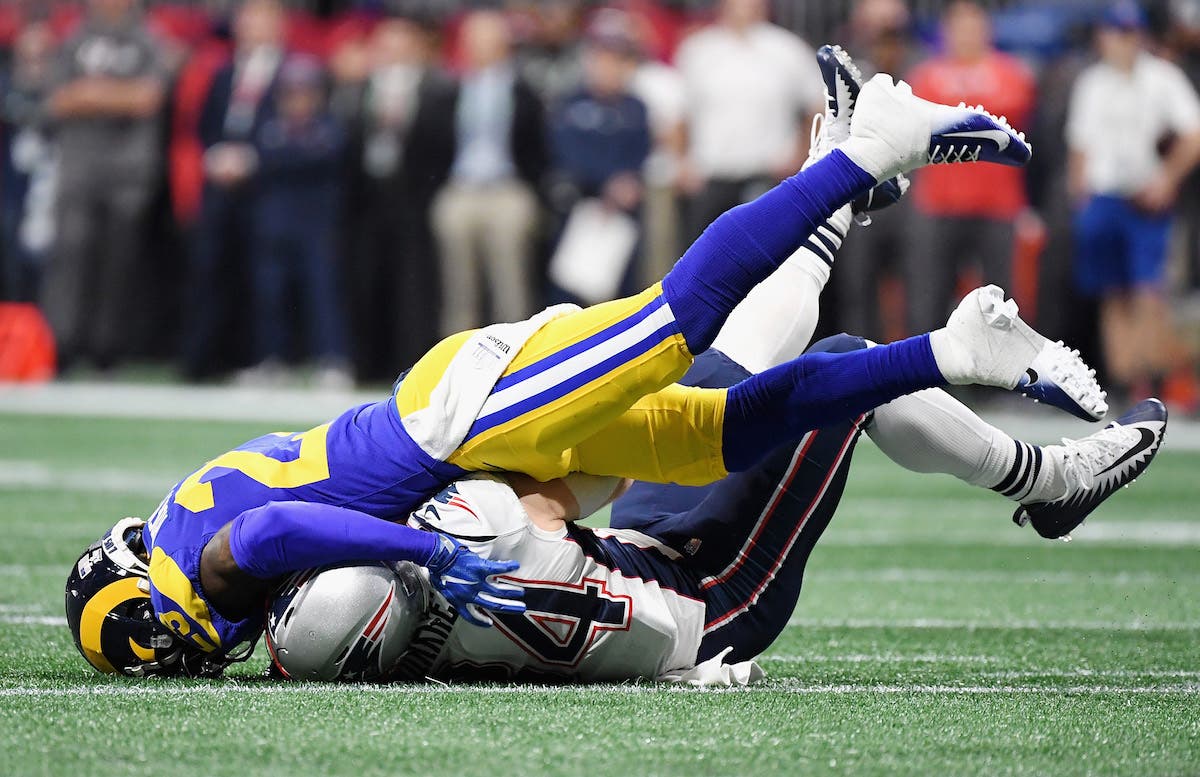 Rex Burkhead (#34) of the New England Patriots is tackled by Nickell Robey-Coleman (#23) of the Los Angeles.