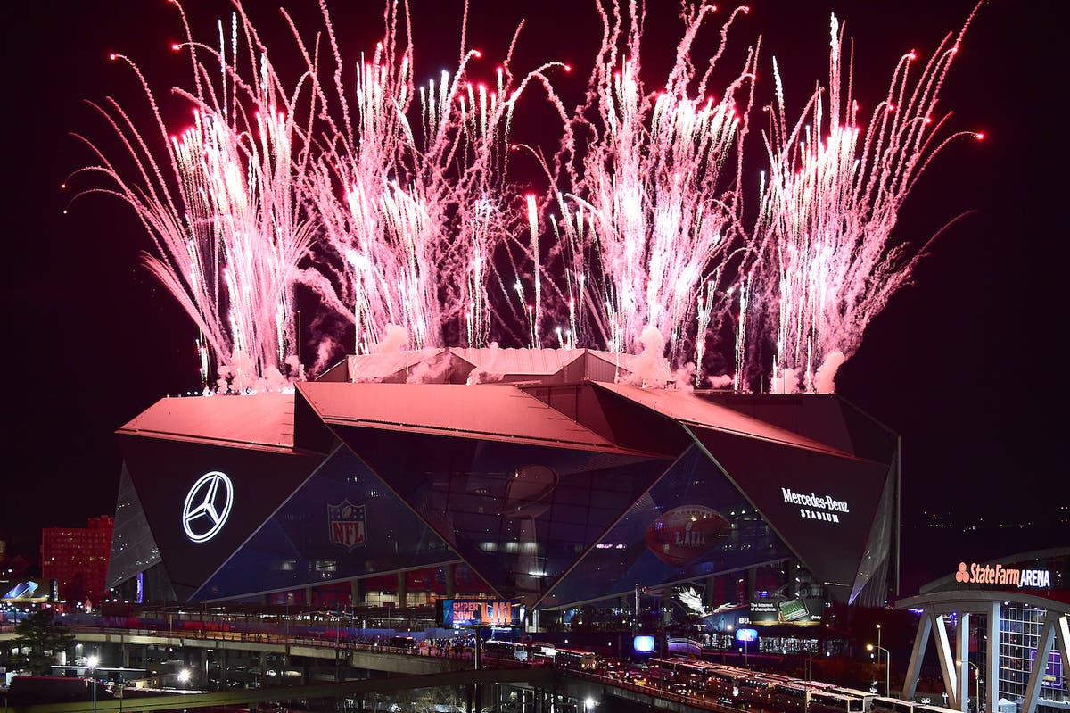 Fireworks shoot in the air above Mercedes-Benz stadium during halftime of Super Bowl LIII between the New England Patriots and Los Angeles Rams.
