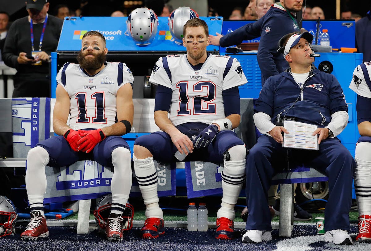 Tom Brady (#12) of the New England Patriots and Julian Edelman (#11) celebrate their teams 13-3 win over the Los Angeles Rams during Super Bowl LIII.