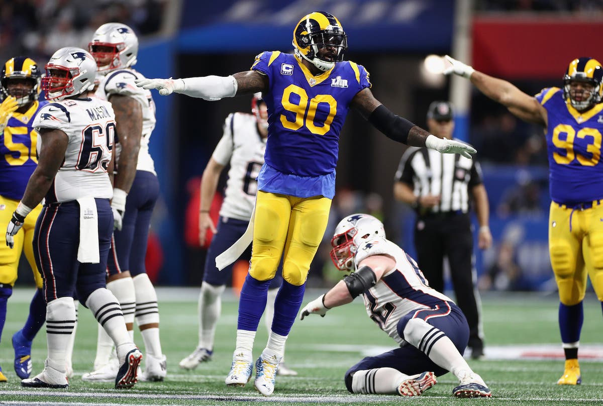 Michael Brockers (#90) of the Los Angeles Rams celebrates in the first half of Super Bowl LIII.