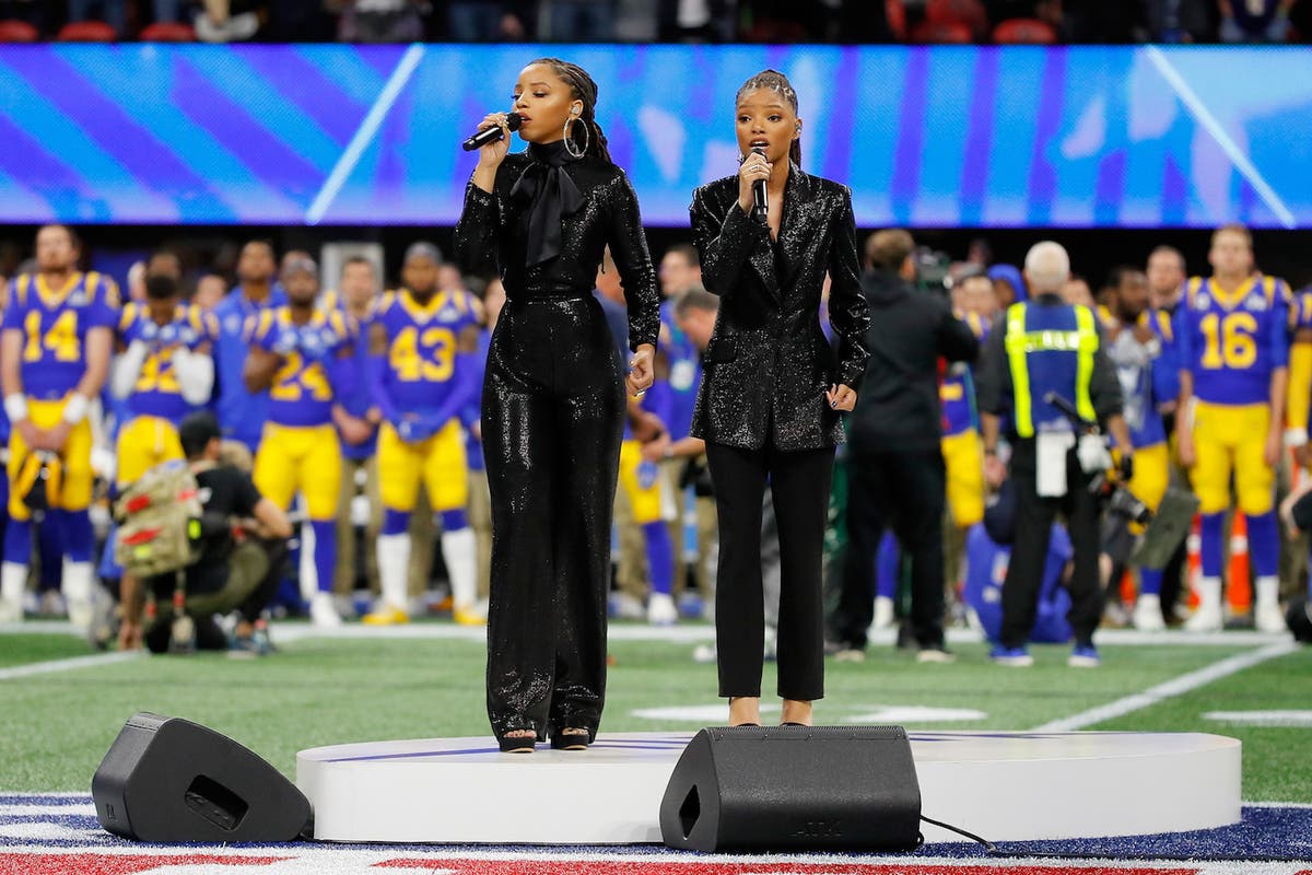 Chloe x Halle sing 'America the Beautiful' during Super Bowl LIII at Mercedes-Benz Stadium.