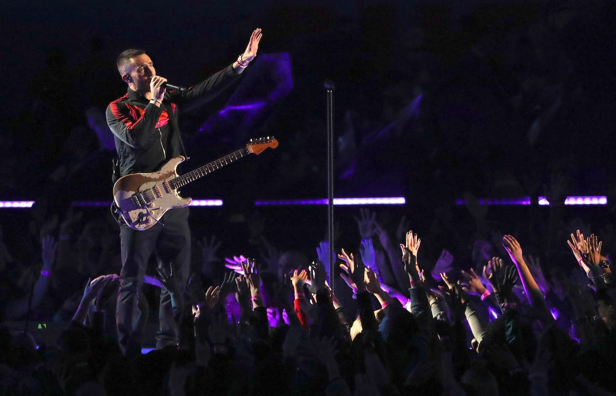 Adam Levine and Maroon 5 perform during the Pepsi Super Bowl LIII Halftime Show.
