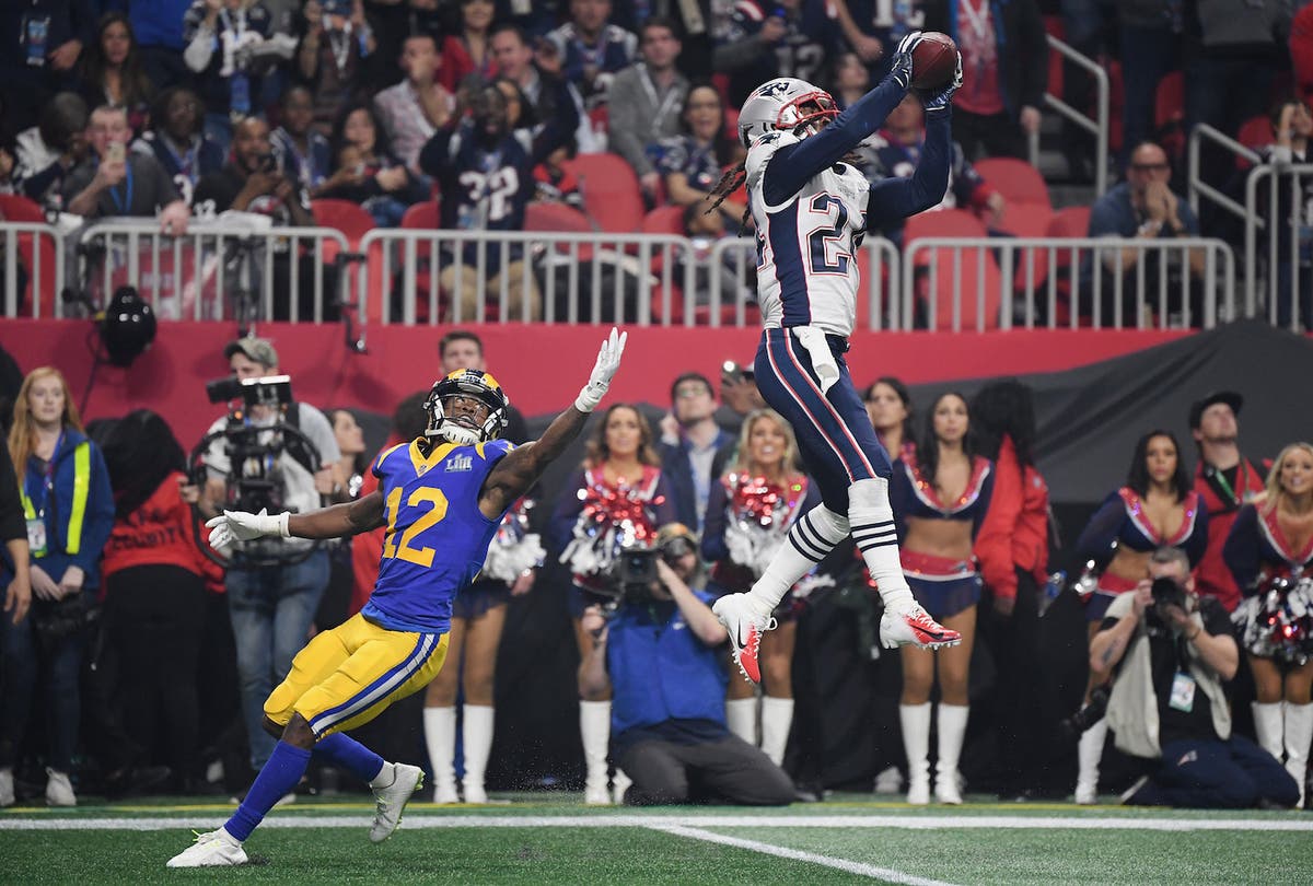 Duron Harmon (#21) of the New England Patriots breaks up a pas to Brandin Cooks (#12) of the Los Angeles Rams in the second half of the game.