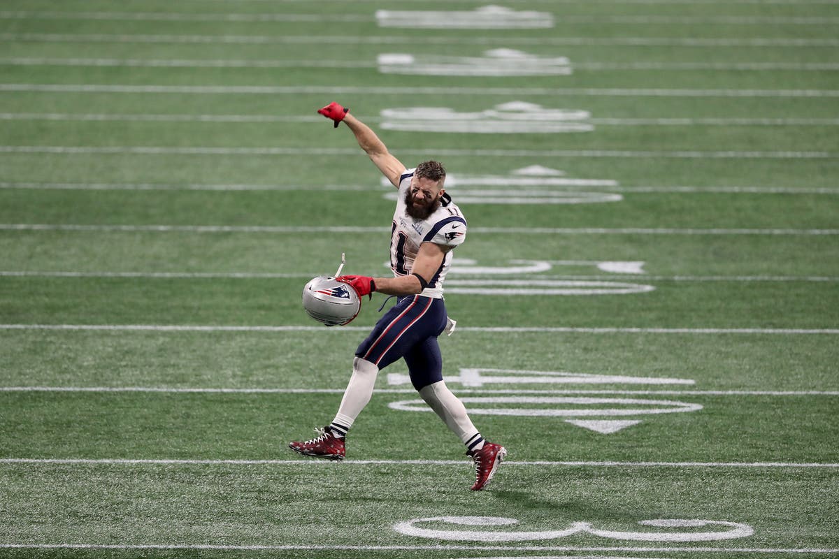 Julian Edelman #11 of the New England Patriots celebrates after defeating the Los Angeles Rams in Super Bowl LIII.