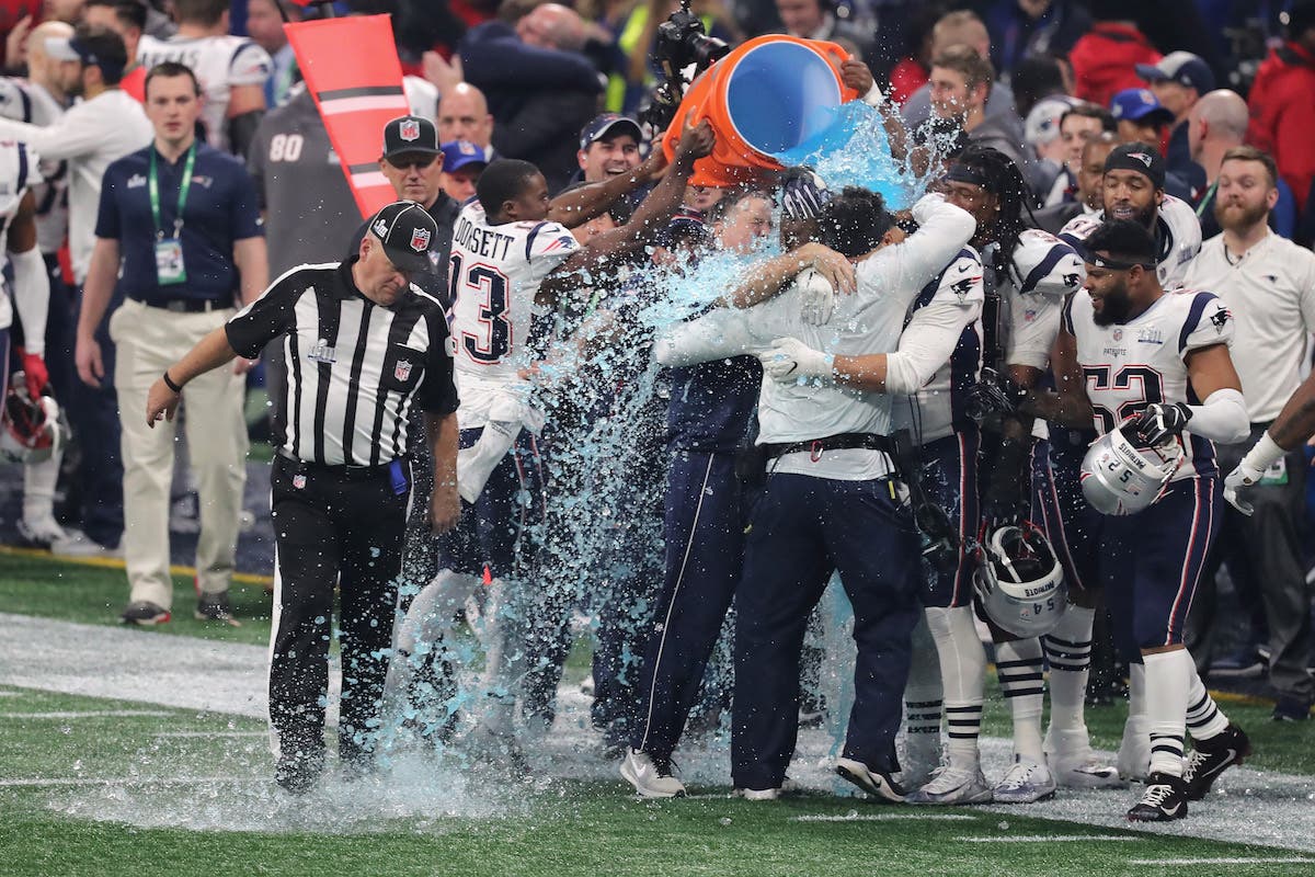 New England Patriots players give head coach Bill Belichick a Gatorade shower after winning the Super Bowl LIII against the Los Angeles Rams 13-3.