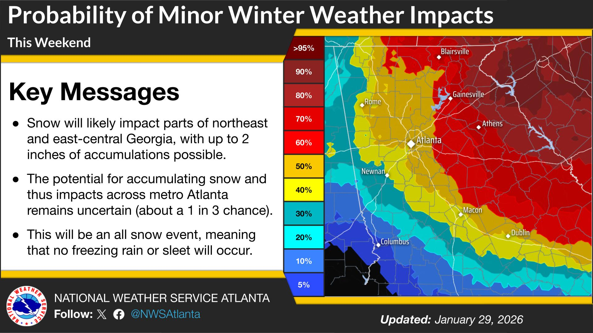 As of Thursday morning, there was a 1 in 3 chance of the storm hitting the Atlanta area. An NWS graphic showed a 50-60 percent probability for the entire metro.