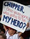 PHOTO 2: A young fan in the stands holds up a sign for Chipper Jones of the Atlanta Braves during a game between the Atlanta Braves and the Washington Nationals at Turner Field on September 15, 2012 in Atlanta, Georgia. (Photo by Mike Zarrilli/Getty Images)