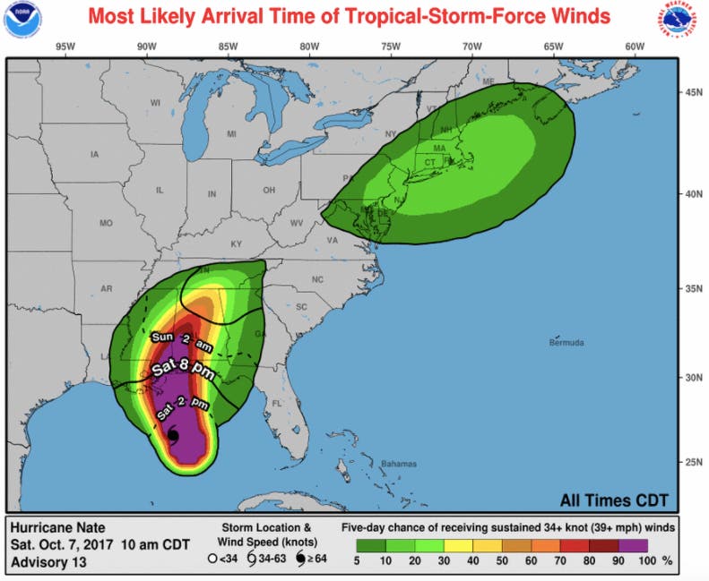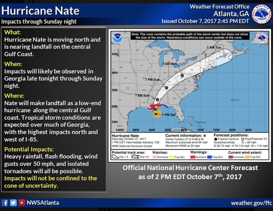 Heavy rainfall, flash flooding, strong wind gusts, and isolated tornadoes are all possible on Sunday afternoon and evening, according to the National Weather Service. Power outages can also be expected, mainly in northwestern Georgia where winds will be the strongest. Because Nate covers a large area, tropical storm conditions can occur outside of the narrow "cone of uncertainty."