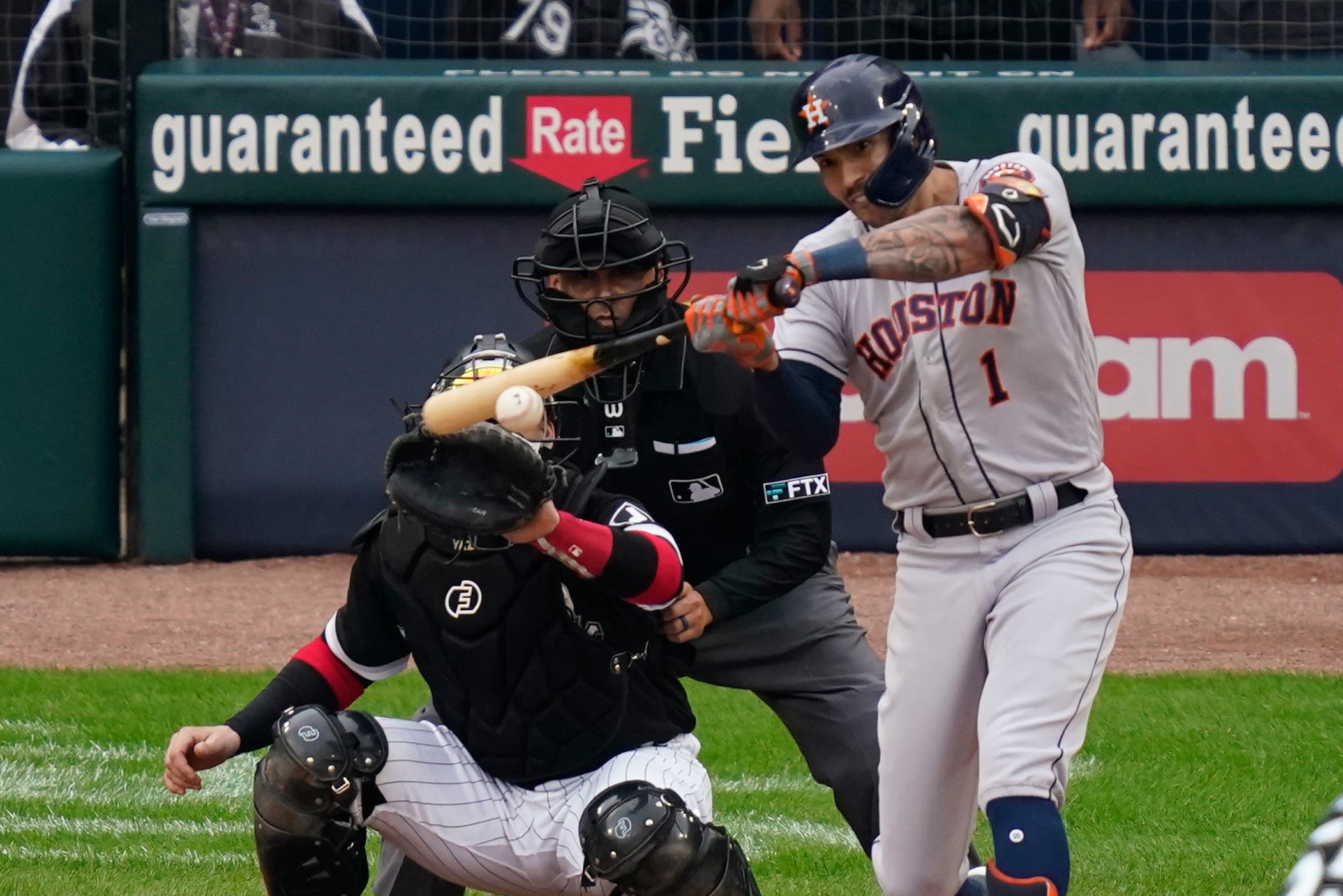 Houston Astros’ Carlos Correa hits a two-run double against the Chicago White Sox in the third inning during Game 4 of a baseball American League Division Series Tuesday, October 12, 2021, in Chicago.