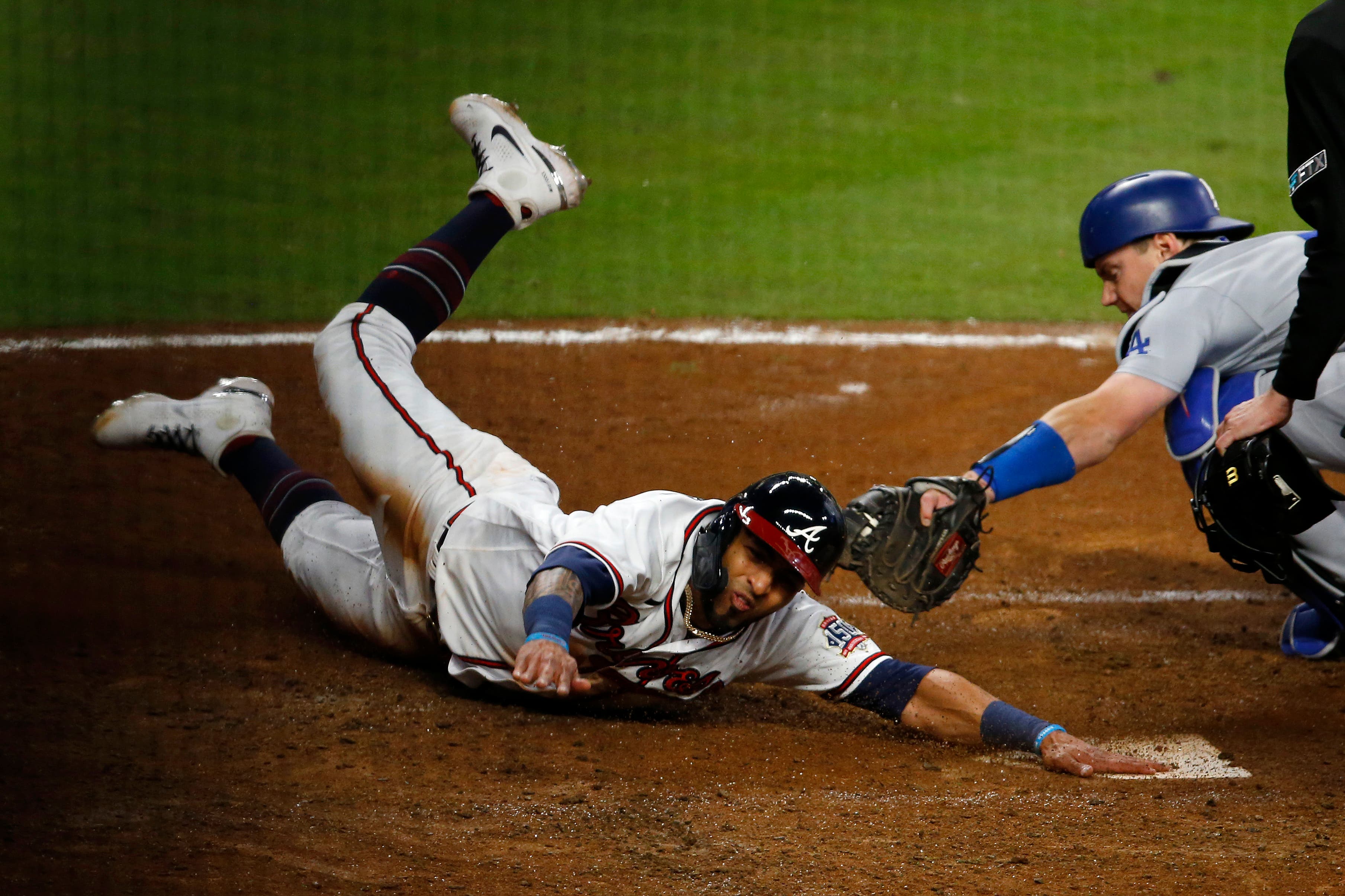 Eddie Rosario #8 of the Atlanta Braves slides safely past Will Smith #16 of the Los Angeles Dodgers to score in the eighth inning of Game Two of the National League Championship Series at Truist Park on October 17, 2021 in Atlanta, Georgia.