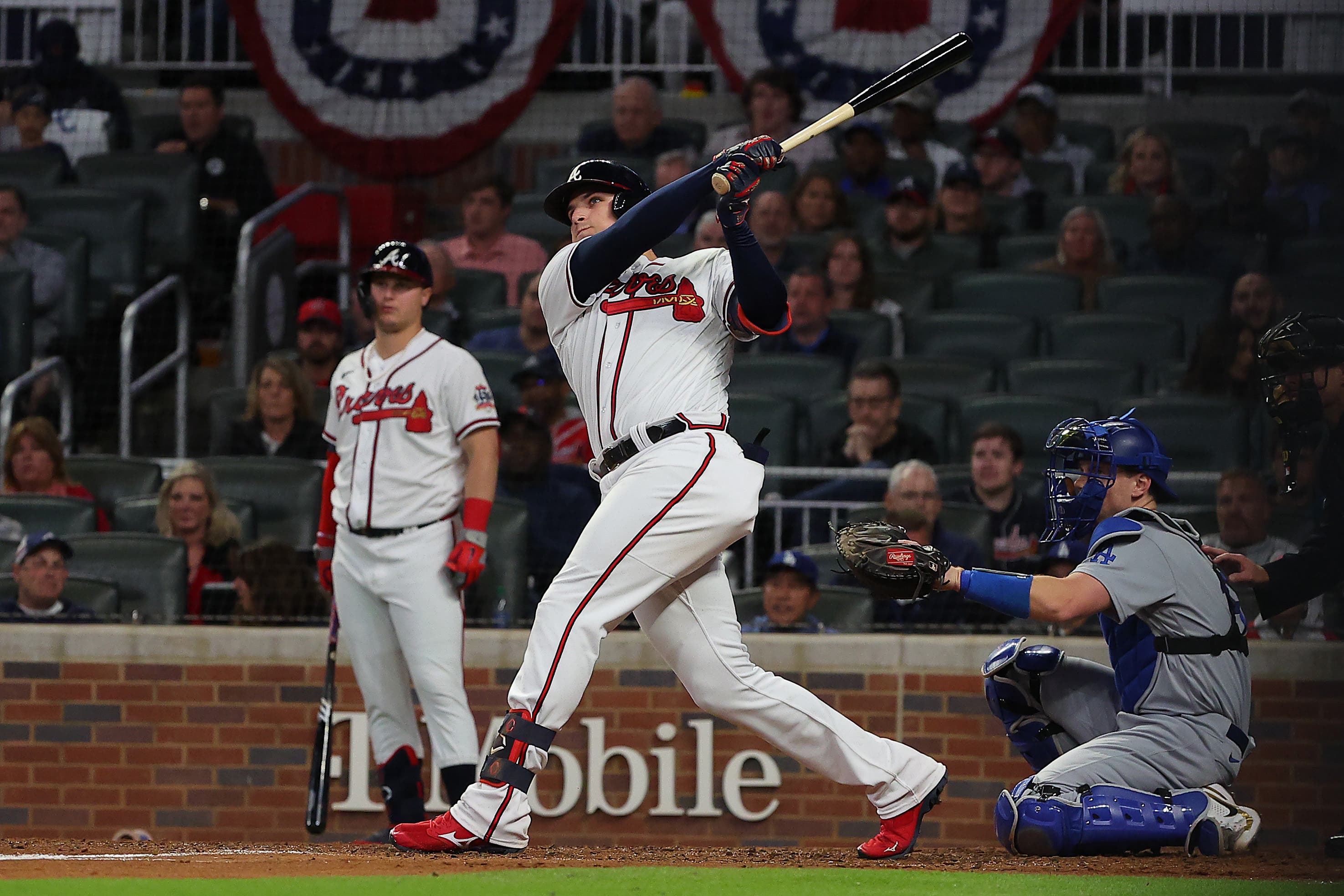 Austin Riley #27 of the Atlanta Braves hits a solo home run off Tony Gonsolin #26 of the Los Angeles Dodgers during the fourth inning of Game One of the National League Championship Series at Truist Park on October 16, 2021 in Atlanta, Georgia.