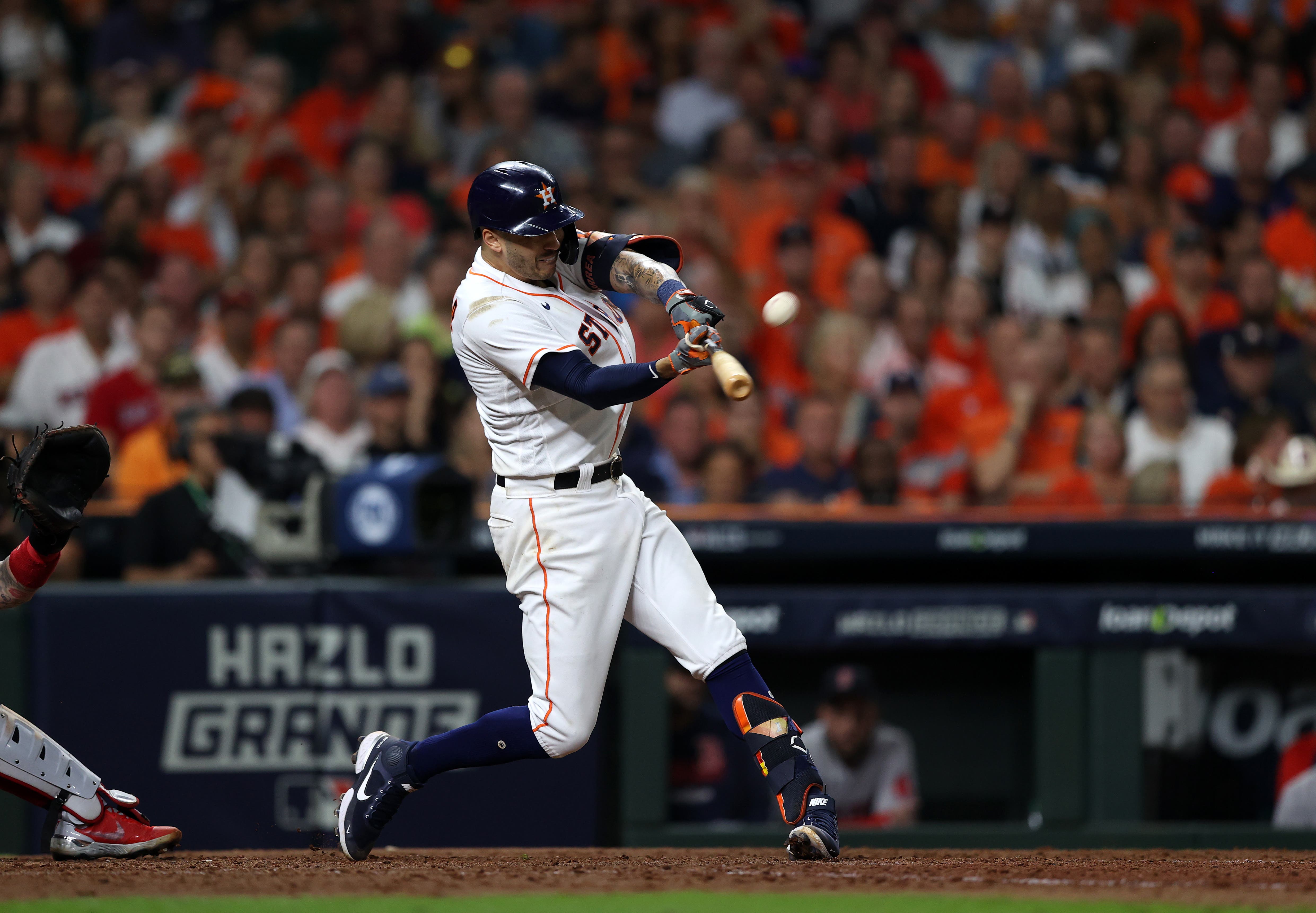 Michael Brantley #23 of the Houston Astros hits a double that scored three runs against the Boston Red Sox in the ninth inning of Game Four of the American League Championship Series at Fenway Park on October 19, 2021 in Boston, Massachusetts.