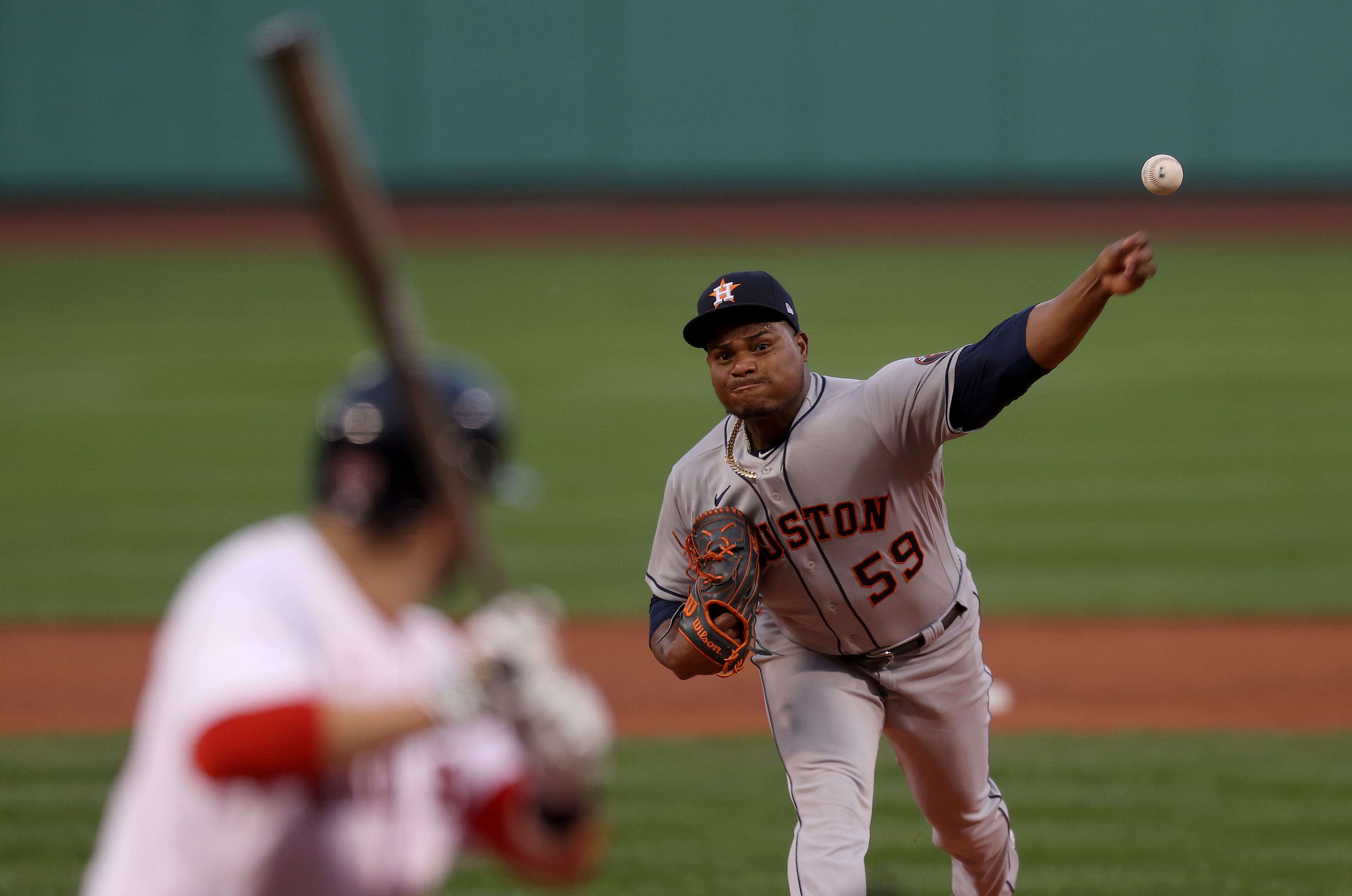 Framber Valdez #59 of the Houston Astros pitches against the Boston Red Sox in the second inning of Game Five of the American League Championship Series at Fenway Park on October 20, 2021 in Boston, Massachusetts.