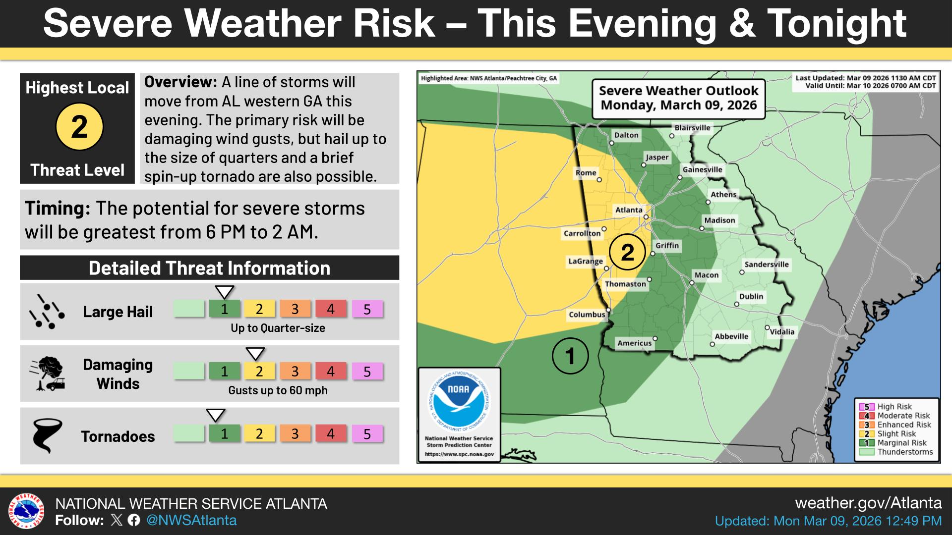 This comes as portions of Georgia are at a Level 2 slight risk for more severe storms Monday, when a brief tornado and 60 mph wind gusts are possible from 6 p.m. Monday to 1 a.m. Tuesday.