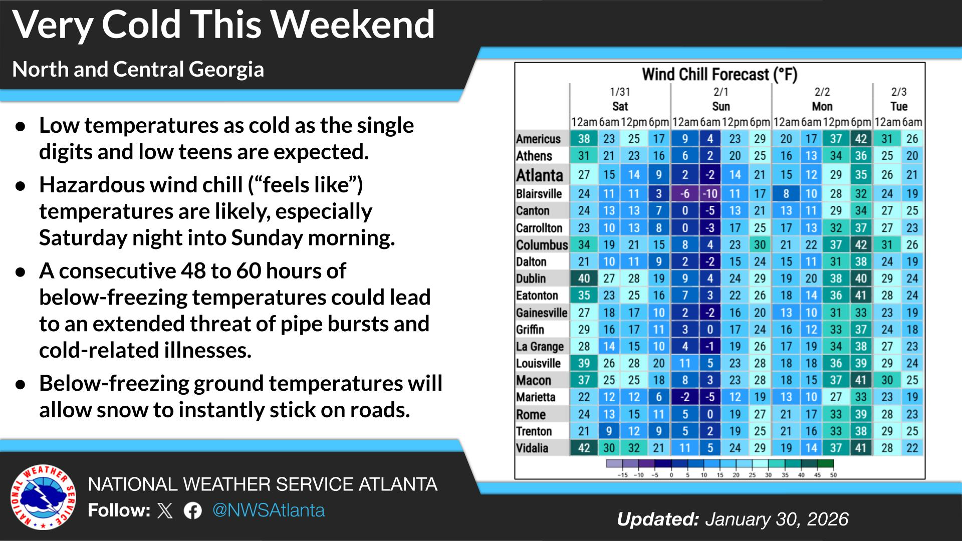 Dangerous wind chill temperatures are also expected for most of north Georgia on Saturday, and across all of north and central Georgia Saturday night into Sunday, according to the state Department of Emergency Management. Wind chills will remain in the teens, and high temperatures will not get above freezing.