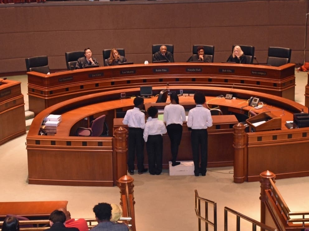 With the assistance of volunteers, students write legal briefs in the fall on a current issue that directly or indirectly affects them. This year’s problem dealt with voter suppression. They learn to think on their feet while formulating and articulating persuasive arguments based on legal precedents and Constitutional concepts. They participate in the Moot Court competition in the spring where they defend their brief in front of a panel of judges. The panel included Georgia Supreme Court Justices, U.S. District Court Judges, Workers Compensation Judges, Juvenile Court Judges, U.S. Court of Appeals Judges, attorneys and law professors.