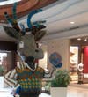 Our Buck was a collaborative effort of four members of the Southeast Fiber Arts Alliance. Our organization supports and promotes all the fiber arts, and the creative concept reflects this. "Mr. Suave" as he has become known to us, was painted by Leisa Rich and Linda Fetter, his trousers were made from fabric hand woven by Suzi Gough, and his vest was designed and knit by Linda Fetter. The shirt was hand painted by Martha Andreatos, his knit yarn antlers were done by Martha, Suzi and Linda, and Suzi created the yarn ball he is holding, which incorporates the SEFAA logo. The "skirt" around the base is made from a vintage quilt top which Martha edged with tape-measure trim.