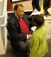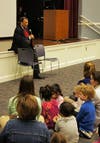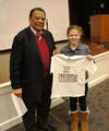 Ambassador Young told personal stories about his life at a school-wide assembly of the Speech School’s four academic programs. He recalled his own school experiences, including that he had early difficulties in learning to read. When asked by one student about his dream when he was young and whether he achieved it, he relayed that he had always wanted to be an Olympic runner. Although he was not able to compete in the Olympics, he was able to help bring the Olympic Games to Atlanta. “No matter what your dreams are, they may not come out the way you want them to, but you will continue to grow and evolve,” he advised the students. He also unveiled the winning design in the Black History Month t-shirt contest, which was won by 4th grade student Kate Maxwell.