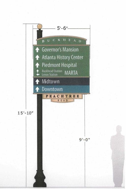 Buckhead's initial nine signs will include directions to the Atlanta History Center, the Governor's Mansion, the AMTRAK Station, Piedmont Hospital, Buckhead and Lenox MARTA Stations, Midtown, and Downtown.