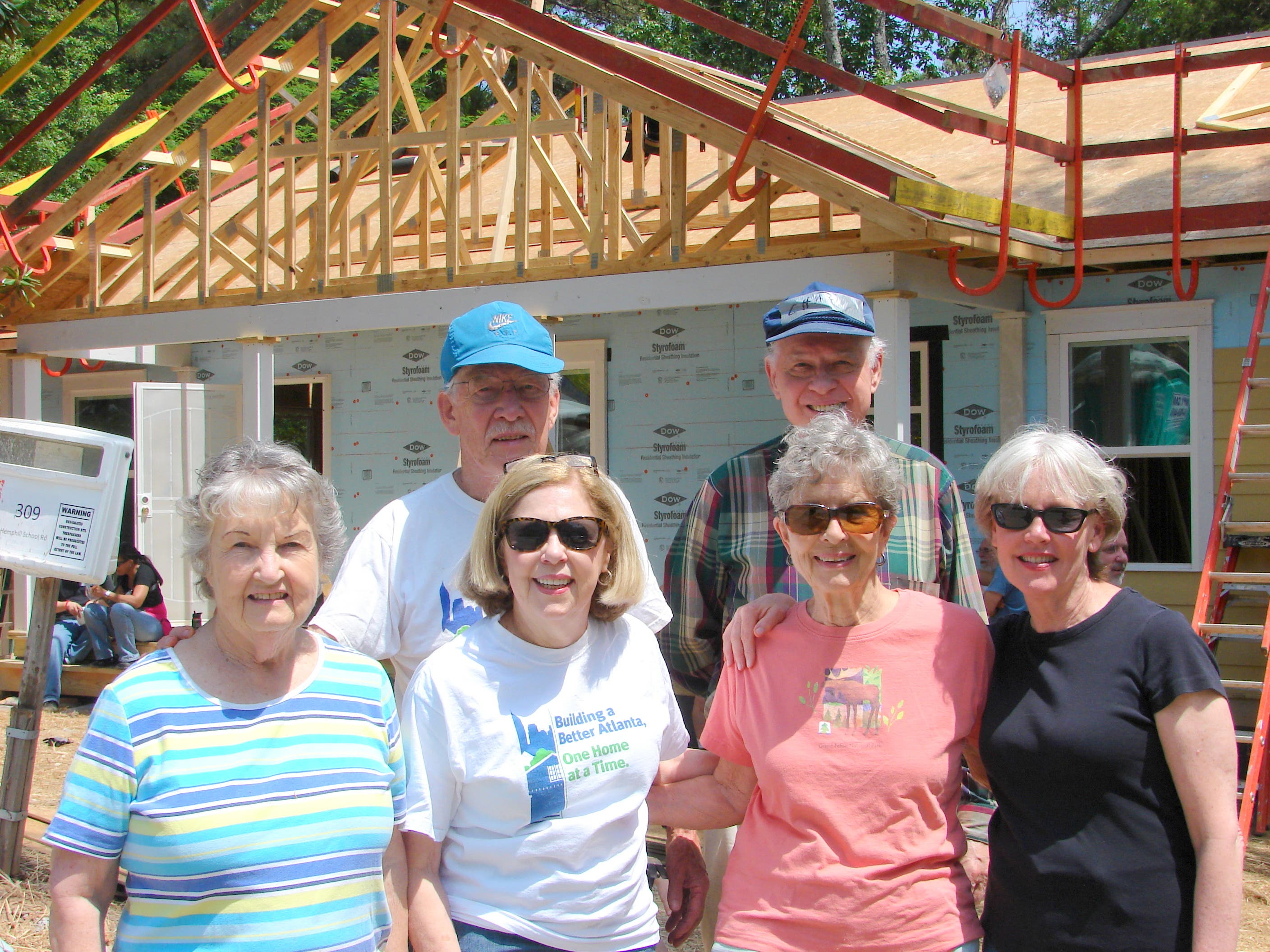Members of Covenant Presbyterian Church in Buckhead are currently building a Habitat for Humanity home with nine other area churches. The home is located on Hemphill School Road in Atlanta, and due to be completed at the end of June. Pictured are (L-R): Front row β Marilyn Roberts, Fran Pughsley, Nancy Elsea and Mary Allen. Back row β Bill Roberts and Chan Roberts