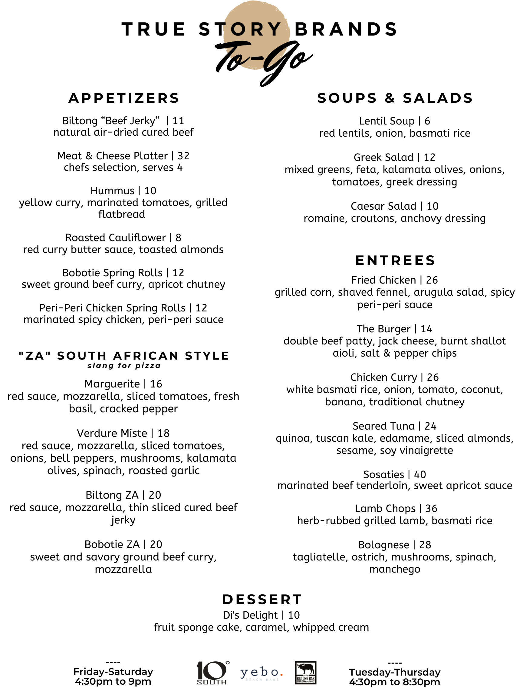 A menu from all three True Story Brands restaurants (10 Degrees South, Yebo Beach Haus and Biltong Bar) will serve popular dishes like Bobotie Spring Rolls; Marinated Beef Tenderloin Sosaties and "Za" – South African Style Pizza, including the 'Biltong Za' with red sauce, mozzarella and thinly sliced cured beef jerky and Marguerite with red sauce, mozzarella, sliced tomatoes, fresh basil and cracked pepper.