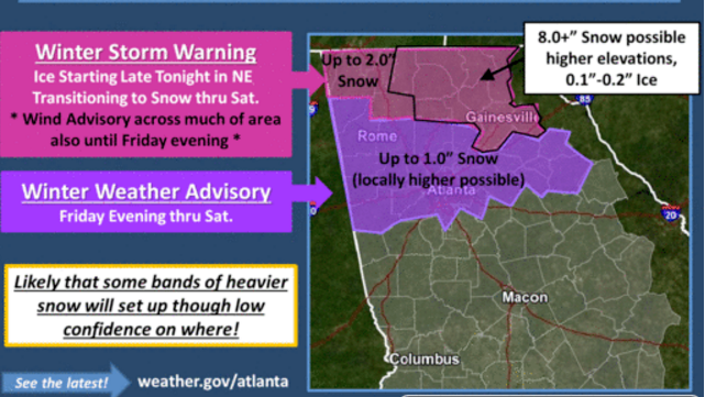 This follows a winter storm warning for much of north Georgia. Up to 1 inch of snow could fall on Atlanta and its surrounding area.