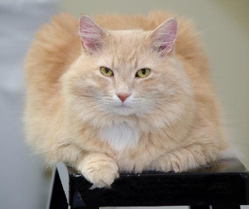 Hi, my name is Cosmo! Can you envision a big, fluffy, buff-orange ball? That’s me, a giant, woolly bear of a cat, who often gets called Lion-O for good reason. I have the softest, most downy, pale peach fur, with a cream colored chest and under-belly. You can usually find me napping atop one of our tall cat trees in the hallway at Furkids. When I’m not napping, one of my favorite activities is playing with kittens. It’s quite comical to watch me in action as I playfully pounce with the little ones.