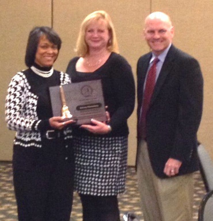 Liberty Elementary School accepted the School Bell Award by the Georgia Association for Elementary School Principals at its Fall Conference on Saturday, Nov. 3, 2012 in St. Simon Island. This distinguished honor is presented to 10 schools in Georgia each year in recognition of outstanding programs in the area of curriculum and organizational leadership. Liberty ES Principal Dr. Nicole Holmes, left, accepts the award from Association President Julie Mashburn and President-elect Jason Miller.