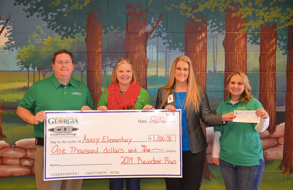 Photo: Jason Blakey and Amanda Arnold (left) Avery Principal Dr. Pam Smith and Service League 2014 Reindeer Run Committee Chair Shannan Cagle. Credit: Service League of Cherokee County.