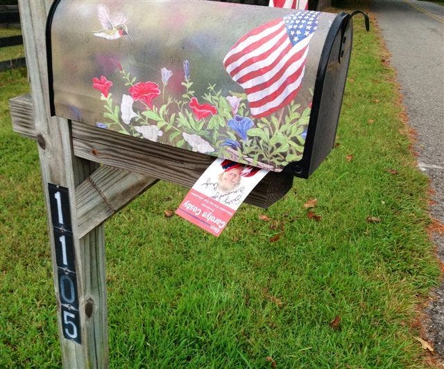 (Photo: a photo submitted by a resident that shows a pro-Carolyn Cosby flier placed on a mailbox, a violation of USPS rules)