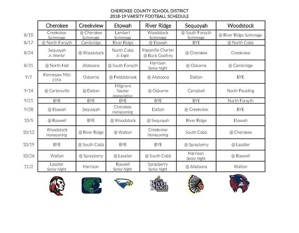 On the first day of the 2018-19 season, the Cherokee Warriors will travel to face off against its counterparts at North Forsyth High School while the Creekview Grizzlies will host Cambridge High School at home. The River Ridge Knights will travel across town to take on the Etowah Eagles and the Woodstock Wolverines will visit North Cobb High School for its first game of the season. The first game for the Sequoyah Chiefs, set for Aug. 24, will be against Cherokee High School in Canton.