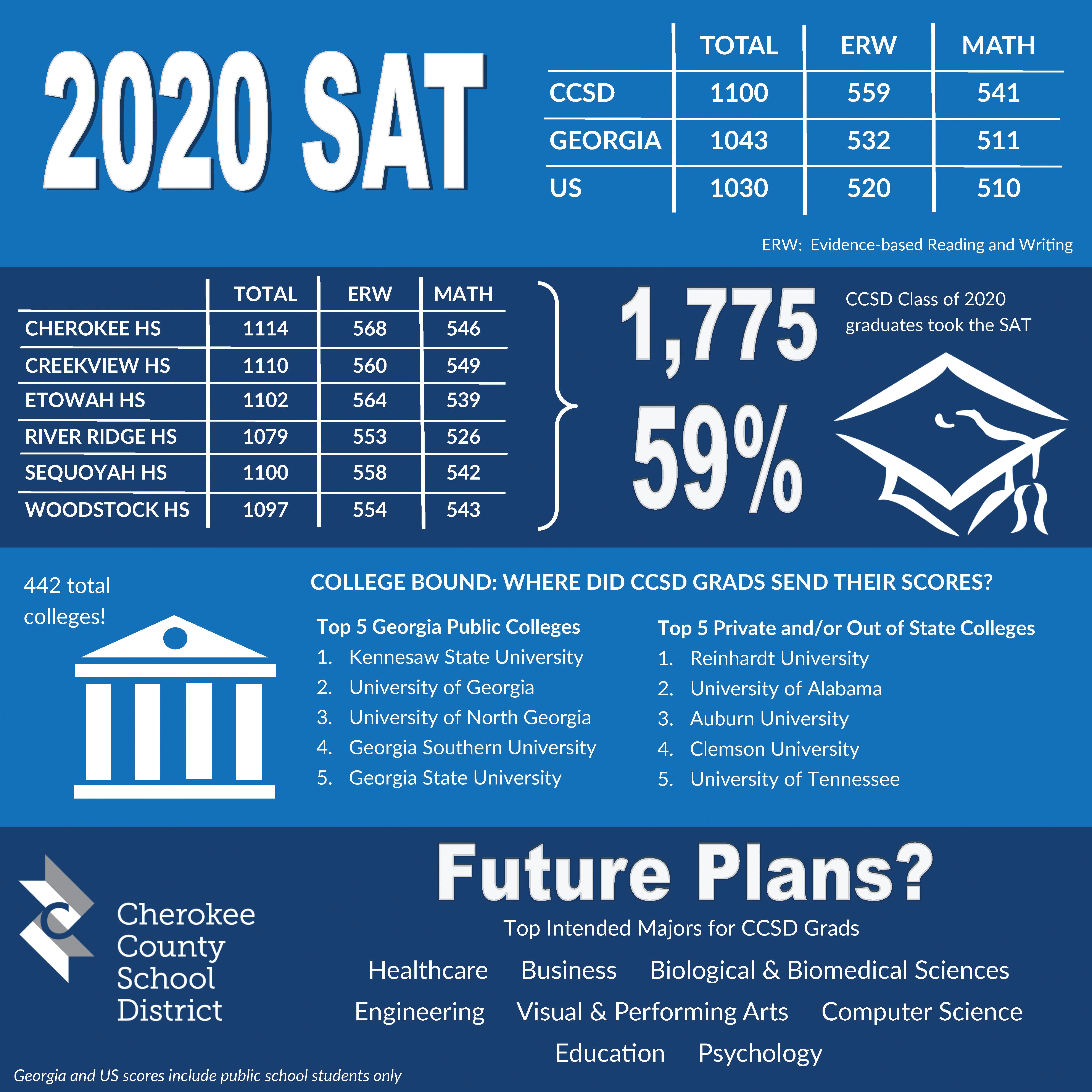The SAT, the most commonly recognized measure of achievement for high school students, measures critical reading and mathematics abilities. It includes two 800-point sections: evidence based reading and writing and mathematics, with a possible total score of 1600; a third section, a writing exam, is optional. The Cherokee County class of 2020 average evidence based reading and writing score is 559, and the math is 541; 59 percent of the senior class took the SAT exam. Some students choose to take the ACT, a different college entrance exam, and some students take both; ACT scores are expected to be released next month.