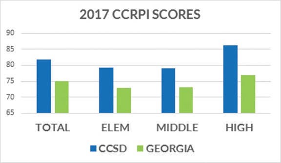 The district's 2016-17 CCRPI average, released Thursday by the Georgia Department of Education, is 81.8, up from 81.6, and tops the satewide average of 75. Scores at all three levels of schools – elementary, middle and high – all surpass state performance; only one district school scores below 70, with a 67 – a decrease from three schools last year, and five schools scored above 90 – an increase from three schools last year.