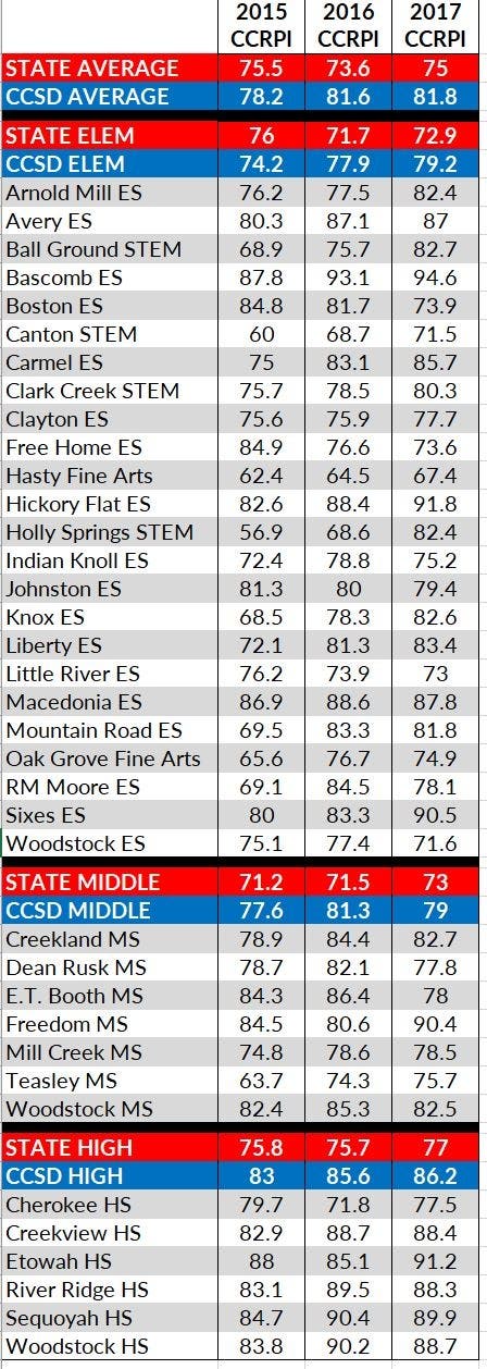 The Cherokee County School District's 2016-17 CCRPI average is 81.8, up slightly from 81.6 and exceeds the state average of 75.