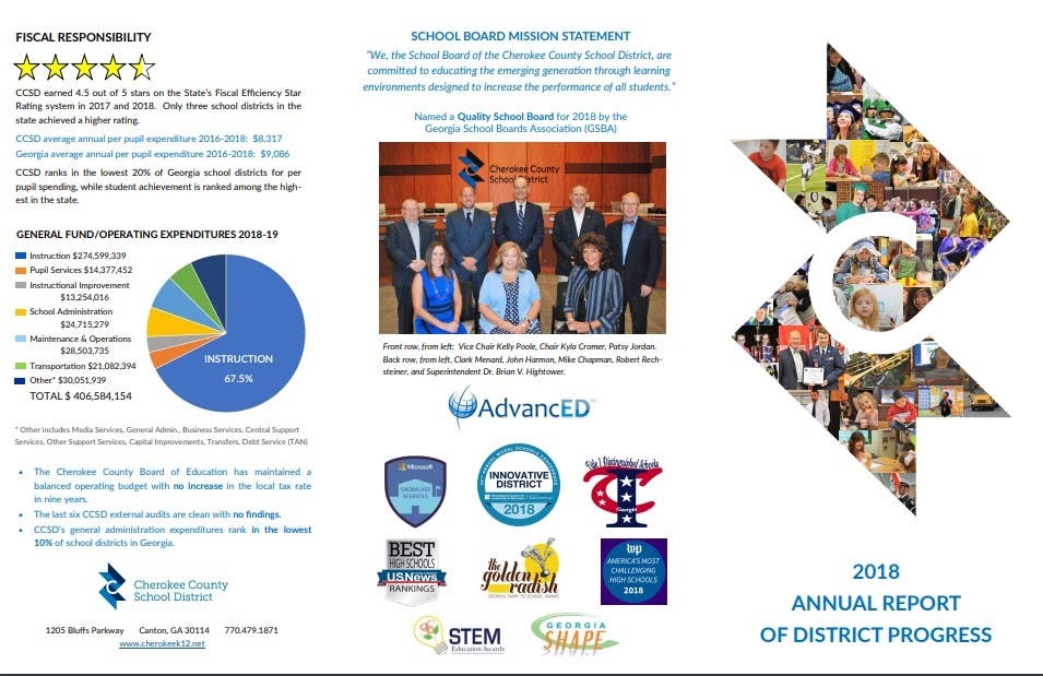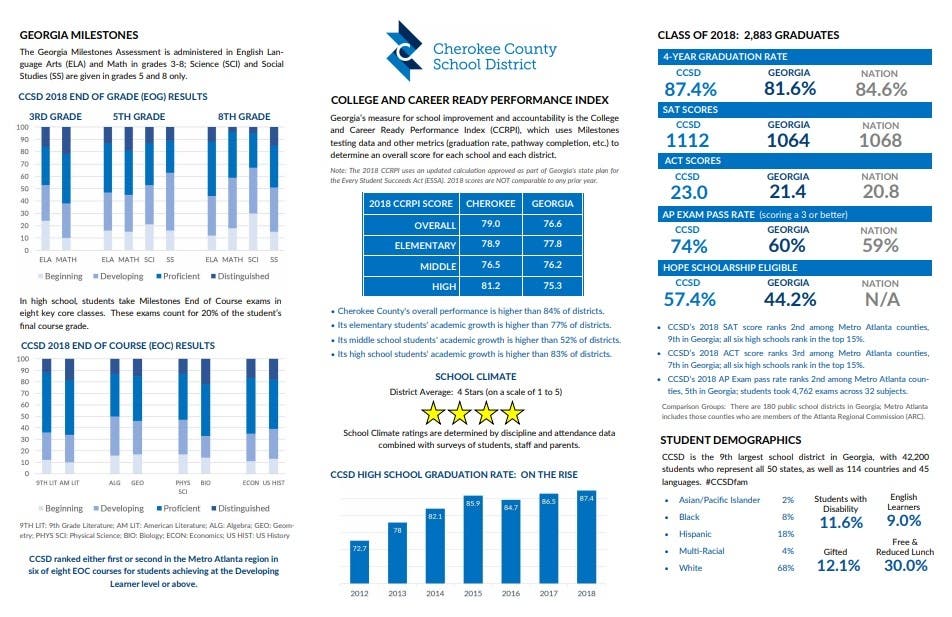 CANTON, GA -- The Cherokee County School District's Communications Division recently released the district's 2018 Annual Report of District Progress, showcasing student achievement and school district accountability across multiple metrics. The data contained in the report is compiled from the 2017-18 school year and is released by the Georgia Department of Education, Governor's Office of Student Achievement, ACT and College Board incrementally from August to February following the close of the school year.
