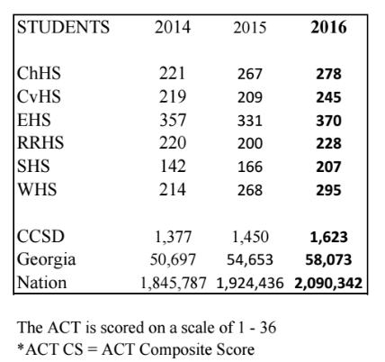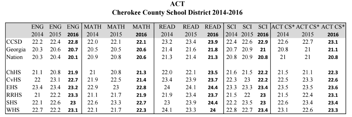 CANTON, GA -- Cherokee County School District's class of 2016 earned the highest-ever score on the ACT college entrance and placement exam.