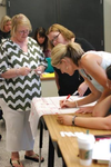 Photo 9: Latonya McGruder, left, and Nicole Bayler, right, both 4th grade teachers from Sixes ES, arrange shapes in a hands-on activity during a class on math instruction strategies.