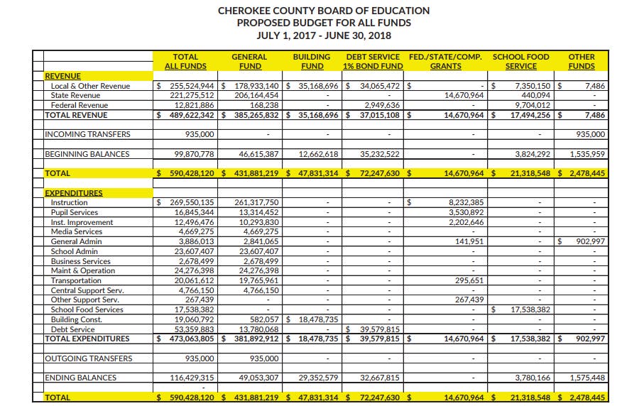 The Cherokee County School Board at its May 18 meeting reviewed the details of the proposed 2017-18 budget.