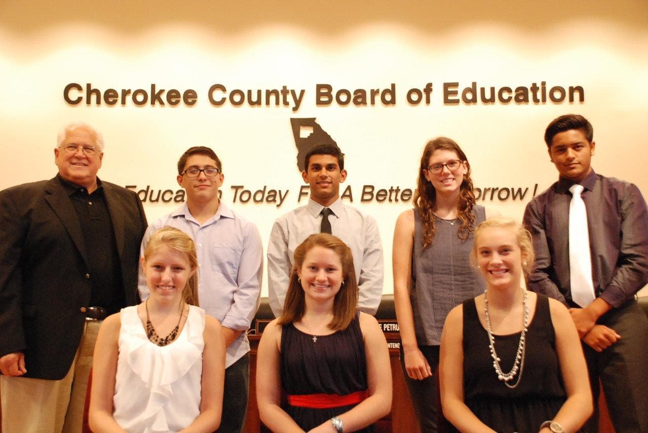 (Photo: Superintendent of Schools Dr. Frank R. Petruzielo congratulates the 2014-15 Student Advisor and Student Delegates to the Cherokee County School Board. From left to right, front row: Cherokee High School, Kathryn Huller; Creekview High School, Calli Ruschmeyer; River Ridge High School, Molly Herring; back row: ACE Academy, Richard “Alex” Fulbright; Student Advisor Parth Patel of Woodstock High School; Sequoyah High School, Isabelle Riddle; and Etowah High School, Rushay Amarath-Madav. Credit: Cherokee County School District)