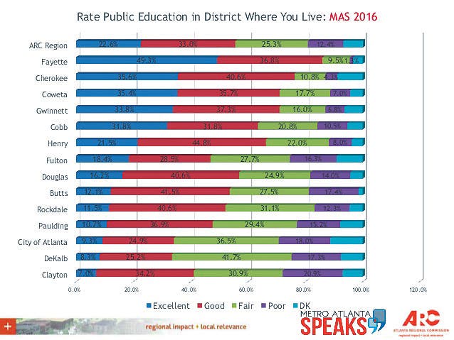 That's according to a poll released Friday by the Atlanta Regional Commission, which found 35.6 percent of respondents describe Cherokee’s schools as “excellent” and 40.6 percent as “good,” for a total that trails only Fayette County.